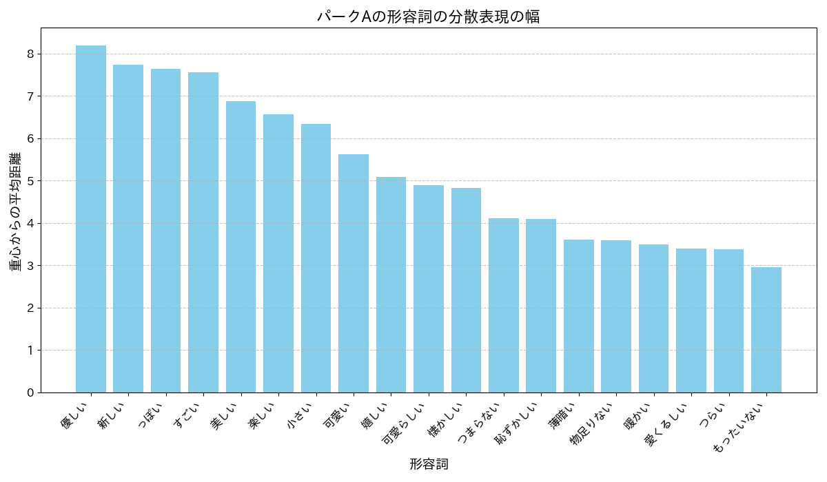 そこで今回は、パークAの「可愛い」という言葉に注目し、この単語がどのような対象や状況で使われているのかを深掘りします。単語が持つ「分散表現の幅」、つまり単語が使われるシチュエーションの多様性を分析することで、お客様の「可愛い」という感情がどこから生まれるのか、その「言葉の広がり」を紐解いていきます。
